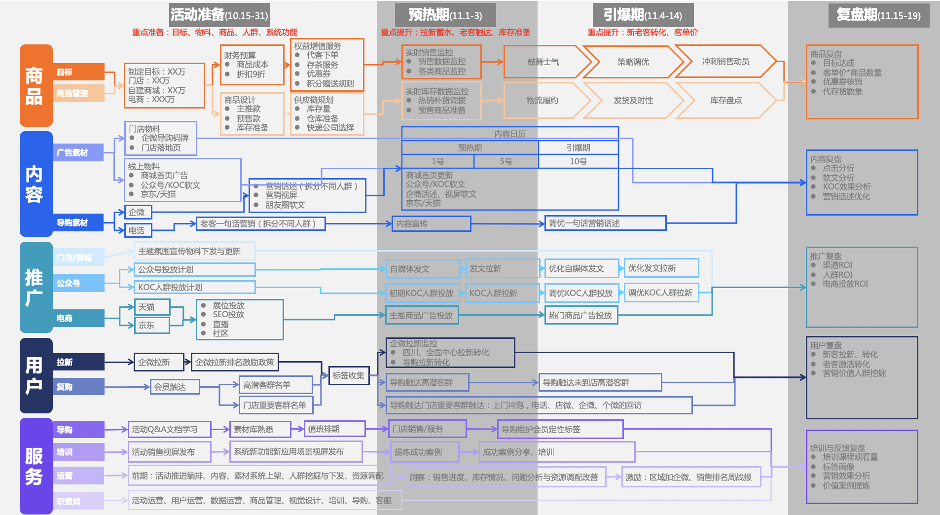 今年双十一,竹叶青联合Ebpay推出了运营升级+数字化系统升级,以双十一业务作战地图为运营指导,围绕目标、商品、内容、推广、用户和服务做了详细规划,并希望构建一套属于竹叶青的营销作战体系。