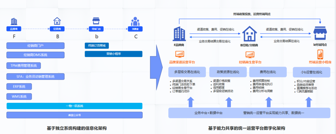 面向消费类品牌,营销一体化平台价值,就是帮助消费类品牌企业实现渠道数字化增长与运营平台,助力品牌企业直达终端网点,提升交易效率和透明度、市场秩序稳定性。
