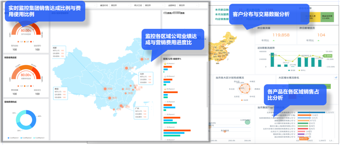 经销商、分销商、终端,费用使用情况,交易数据,区域贡献度,区域产品偏好等数据,实时统计,及时分析,为经营策略给予数据支撑