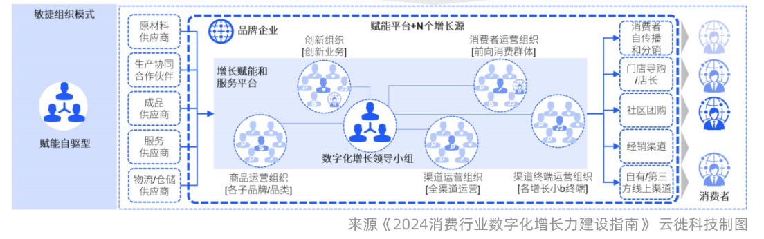 数字化技术驱使企业商业模式和运营方式发生变化,企业形态由封闭管控型,转向开放赋能型,最大化链接产业产品和服务资源为消费者给予最佳体验,从流程、数据和团队角度促进增长运营能力提升。第一时间是业务驱动力转型,一路向C,消费产业数字化变革序幕拉开,增长驱动力从制造端转向消费端:消费体验需求对整体产业链进行的逆向数字化改造已经开始,传统营销、渠道和供应链逻辑均要发生彻底革命,最核心是增长逻辑起点和驱动增长的资源运营逻辑起点发生改变。其次是运营模式转型,一路向D,满足部门职责、任务分工需求的僵化流程和孤立数据,全局非最优解,转变为满足增长和效率需求的策略迭代和流程优化,提高全局资源效率最大化。第三,从组织机制转型,一路向E,伴随数字化建设的不断推进,不断创新迭代的新组织形态,需打破原有科层制职能和组织边界,打通和聚合公司层面的各业务条线以及职能力量,形成面向消费者、渠道、产品和场景的一体化运营能力,支撑资源最有效的投向在各类增长源。