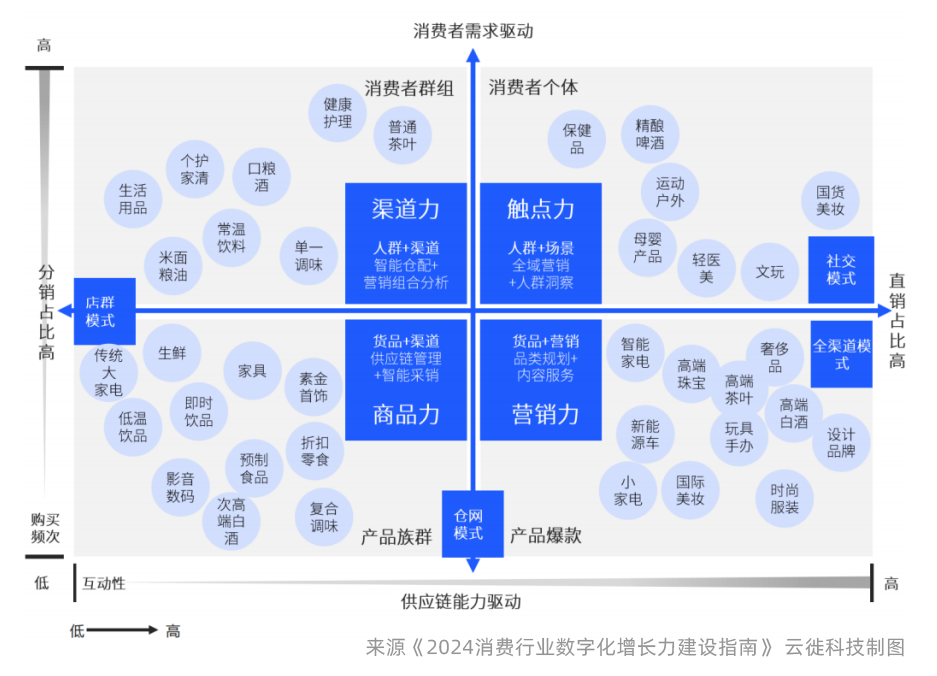 其中,需要突出说明的是,私域是很多消费企业关注的热门话题,但是不是所有品类均适合做私域?事实上,右边象限的信任度高、品牌力低、受众精度高、产品差异化大的细分品类的“私域”运营性价比较高更应把触点力和营销力作为核心业务驱动力建设,在消费者个体和产品爆款上做文章,而其他驱动力是非业务核心驱动力,只作为基础能力存在。左边象限的消费群里更适合在消费者群体、商品族群上做文章,做私域的投入产出比不高。