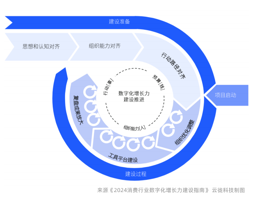 比如以渠道力构建为例,在节点在线化阶段向业务一体化阶段跨越时,涉及到商品、订单、经销商运营和渠道终端四个方面,需要明确数字运营能力的横向边界,以及数据运营深度,清晰界定出不同阶段的演进重点。其中,需要认识到数字化增长力构建是一个复杂的系统工程,不是单方面技术问题,需要与时间做朋友,考虑未来目标走得过去,过往成果该留留该弃弃,逆向思考、正向行动、循道而行。